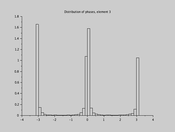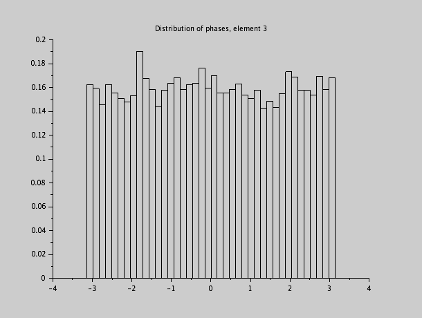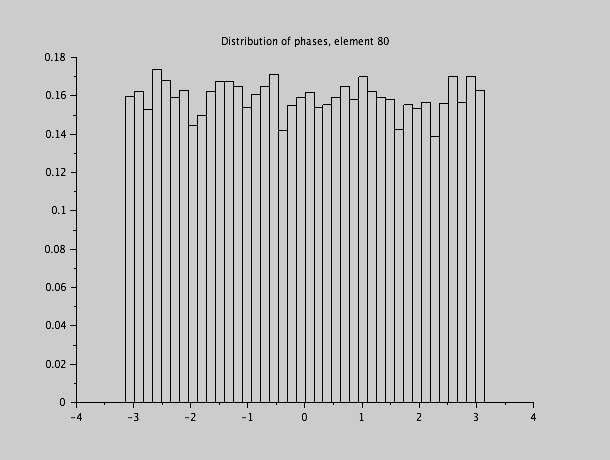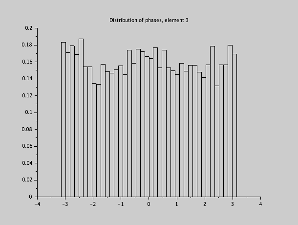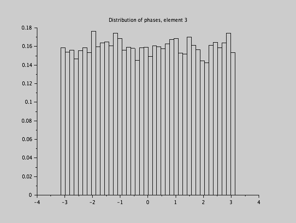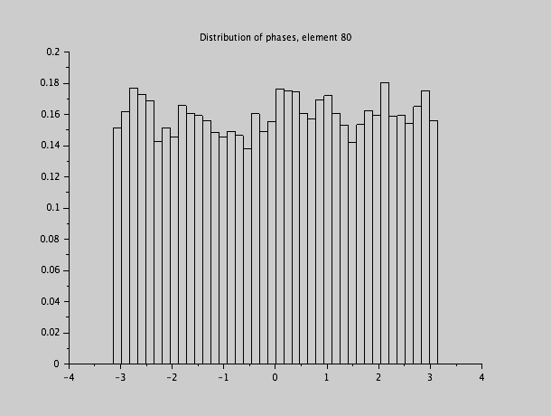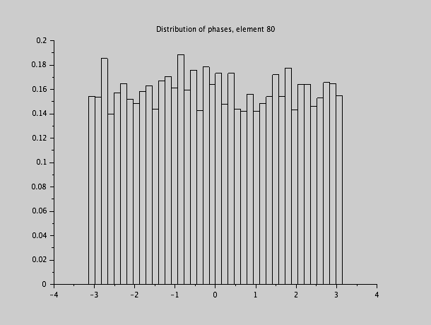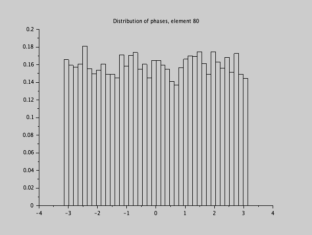 The distribution of the phase of the third and the 80th frequency component (which are expected to be uniformly distributed) is nicely uniform as it should be. If it isn't, there is a problem with the statistical independence of the random number generator. Note that the correlation between the phases between different frequency components is perfectly uncorrelated, as expected.
