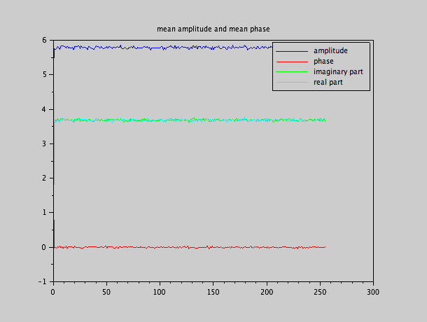 Finally, the average of the distribution of amplitudes, phases, the real part and the imaginary part of the frequency component is shown. For white noise, we expect this to be constant. It is indeed the case.